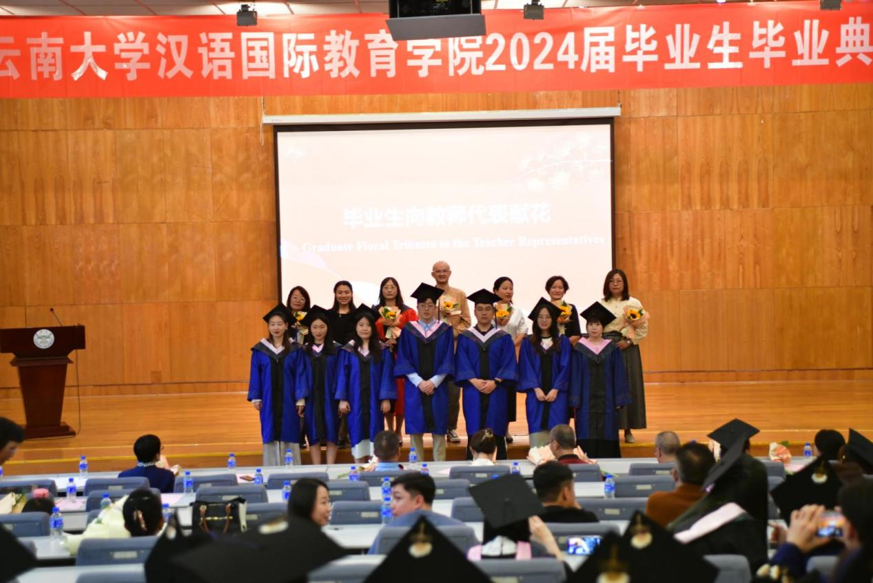 越南籍本科生代表阮飞龙同学回顾了自己在学校四年学习与生活的点点滴滴,向老师们的辛勤付出表示衷心的感谢。四年前他怀揣着对汉语的热爱和对中国文化的向往,从越南来到云大开启求学之路。他表示今后继续踔厉奋发,发扬云大精神,不断追求卓越、超越自我!
