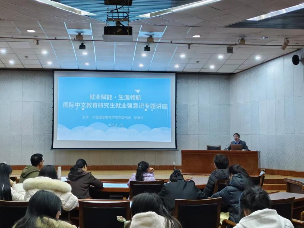 陈善江书记深入剖析国际中文教育专业发展前景与就业方向,结合国内及南亚东南亚市场需求,梳理出海外孔子学院 / 华文学校/海外高校、国内中小学 / 国际学校、大中专院校 / 跨境教育企业、公考 / 选调生、国内外攻读博士学位等主要就业赛道与发展领域,并正式启动“研一强意识、研二明方向、研三促行动”三级就业行动计划。他详细阐释:研一侧重行业认知与优势挖掘,研二聚焦赛道选择与实践积累,研三着力精准求职与政策对接,为学子规划清晰的阶梯式成长路径。同时,他倡议学生将个人职业发展融入“一带一路”中外文明互鉴使命,鼓励研一学子“早调研、早规划”,研二学生“传经验、带新人”,在行业发展中找准自身定位。